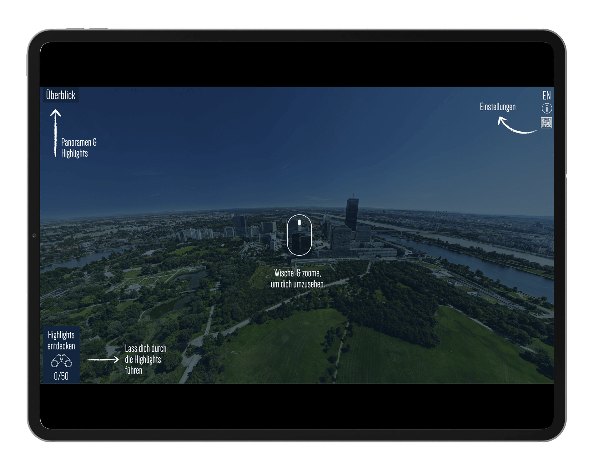 Ein neu gestaltetes Erklärungs-Overlay unterstützt bei der Orientierung und erleichtert den Einstieg. Die Tour ist responsiv umgesetzt und für Desktop, Tablet und Mobile optimiert. Sie steht in deutscher und englischer Sprache zur Verfügung, sodass Besucherinnen und Besucher die Stadt aus der Vogelperspektive flexibel erkunden können.
