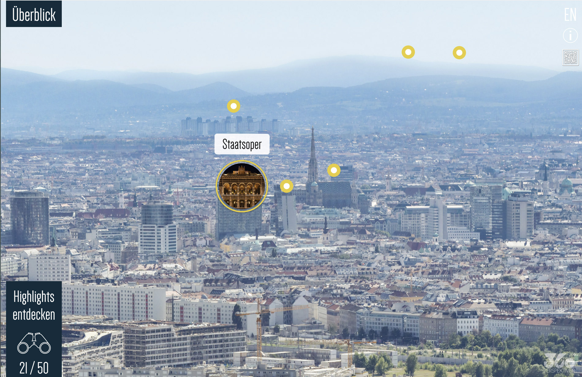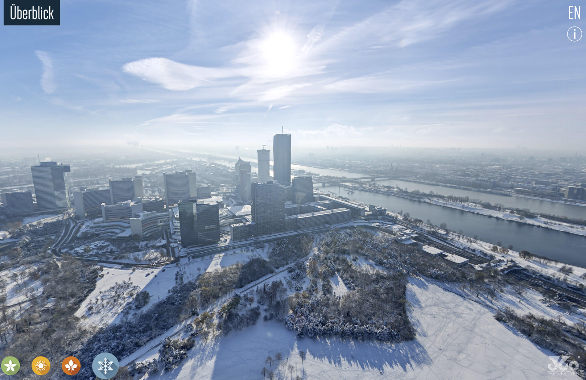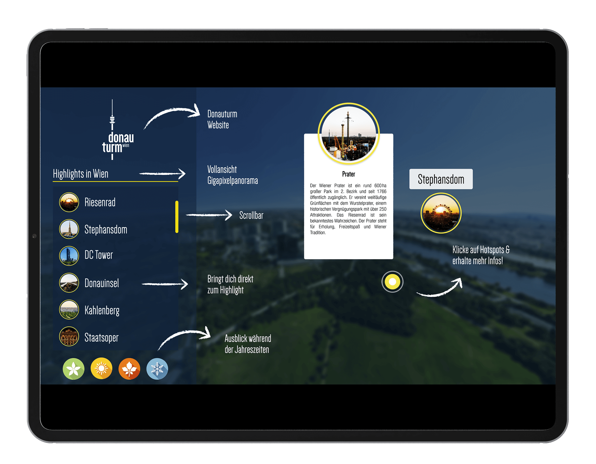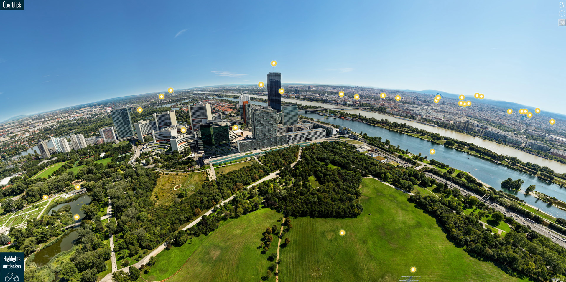 Die 360-Grad-Experience-Tour am Donauturm präsentiert Wien aus luftiger Höhe in hochauflösendem Gigapixel-Panorama sowie in stimmungsvollen Aufnahmen der vier Jahreszeiten. Die Tour bietet ein komplett neues Menü mit Scroller, über das Besucherinnen und Besucher Sehenswürdigkeiten schnell ansteuern können. Die Anwendung zoomt automatisch auf den gewählten Spot, zeigt ein Vorschaubild und öffnet bei Klick eine Contentbox mit detaillierten Informationen. Gleichzeitig ist freie Navigation im Panorama möglich, und Hotspots liefern zusätzliche Inhalte bei Mouseover.