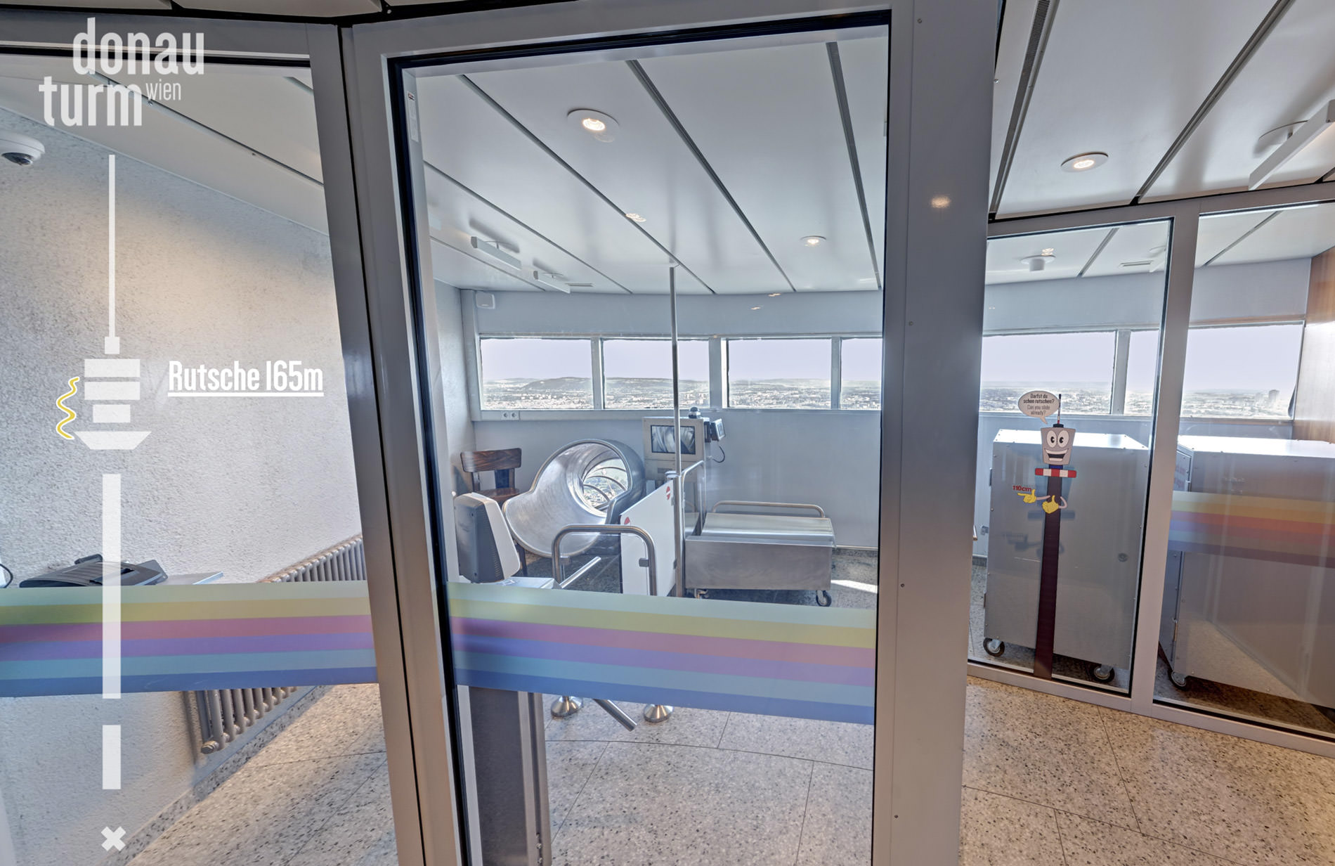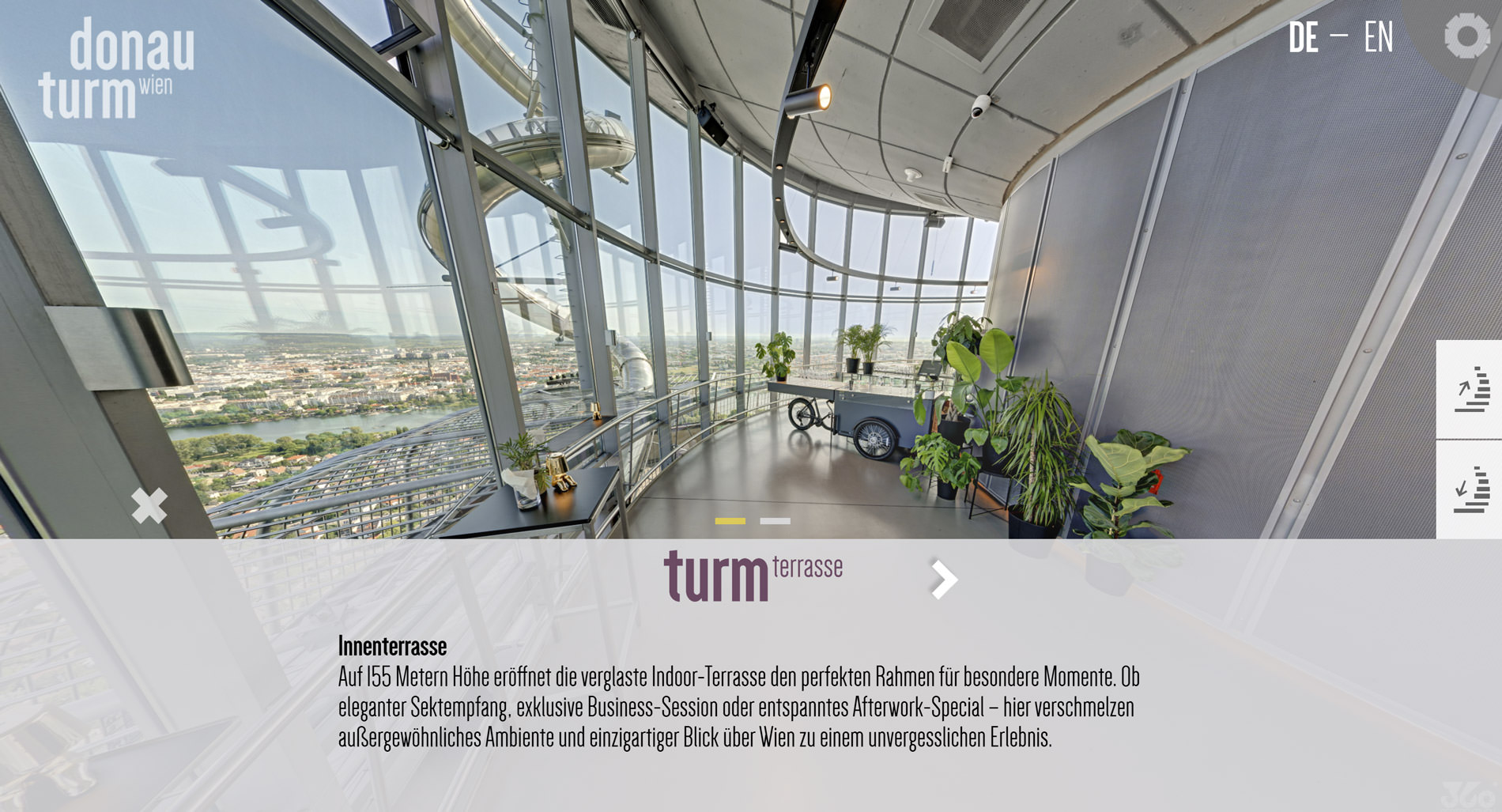 Ergänzend wurde eine eigenständige Event-Tour programmiert, die gezielt die Event-Räumlichkeiten des Donauturm präsentiert. Dabei wurde die Tour modernisiert und an die aktuellen baulichen Veränderungen angepasst – etwa die neue Rutsche – und bietet eine übersichtliche, interaktive Möglichkeit, die verschiedenen Etagen und Räume digital zu erkunden.